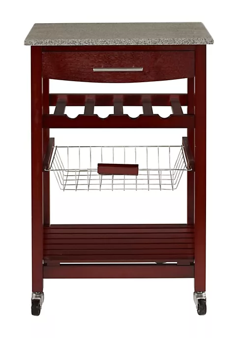 - Simple Durable Design With A Wenge Wood Finish And Chrome Hardware | Food Safe Easy To Maintain Gray Granite Top | Convenient Storage Including Front Drawer Four Bottle Wine Rack Wire Produce Basket And Bottom Shelf