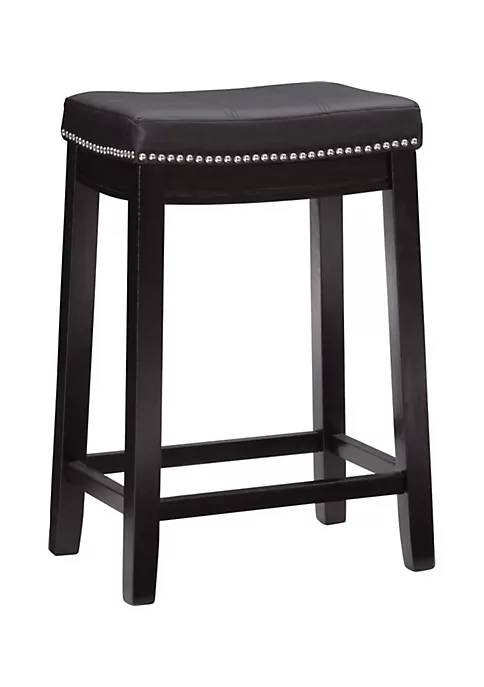 - Black faux leather padded seat | Black wood finish | Shiny silver nail head | Seat top sewn with double needle stitching for durability | Assembled size 18.25inw x 12.75ind x 26inh | Seat height 26in perfect for counter heights of 35in- 39inh
