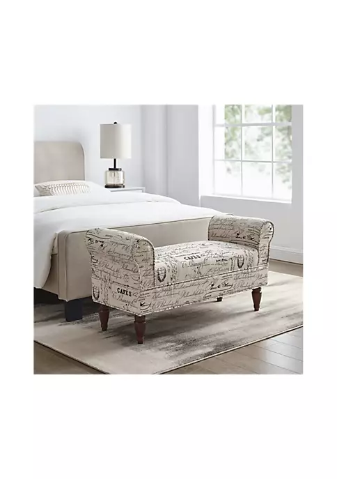 - Dark mahogany feet finish | Linen upholstery | Ultra plush seat | Rolled sides add interest. | Perfect for a bedroom living room or entry | Seat dimensions 16.75in seat height 33inw x 17ind x 9.5in thick