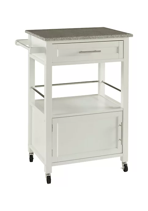 - Clean durable design with a bright white finish and silver hardware | Food safe easy to maintain gray granite top | Ample storage including top drawer shelf with metal railing and enclosed cabinet | Durable easy rolling wheels with 2 locking casters | Efficient kitchen storage and food preparation or entertaining in any room | Sturdy solid wood frame